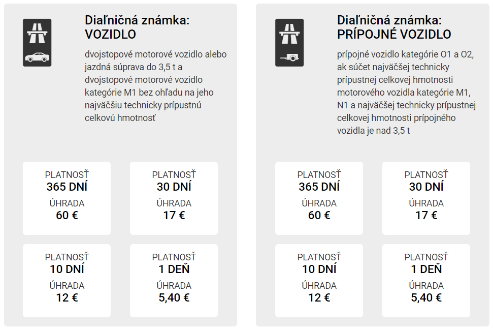 Dálniční známku na Slovensku si lze koupit jak pro vozidlo do 3,5 tuny, tak i pro tzv. přípojné vozidlo, tedy vozidlo nad 3,5 tuny.