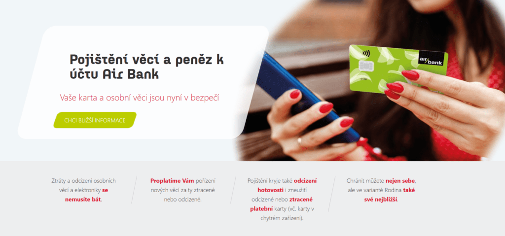 Například pojištění věcí a peněz k účtu Air Bank umožňuje klientům Air Bank nahlásit pojistnou událost, jako odcizení hotovosti či zneužití ztracené platební karty, skrze online formulář na webu pojišťovny. Za toto pojistné zaplatí jednotlivec 50 korun měsíčně, rodina pak 100 korun měsíčně.