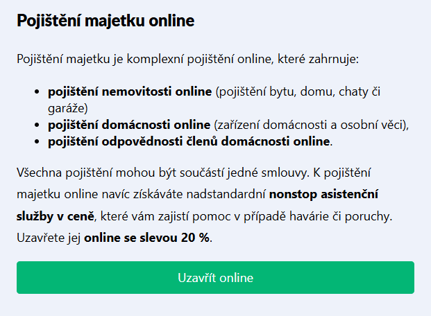 UNIQA svým klientům umožňuje sjednat online povinné ručení, havarijní pojištění, pojištění do zahraničí, pojištění na hory a pojištění majetku. Pojištění majetku online lze navíc uzavřít s 20% slevou.