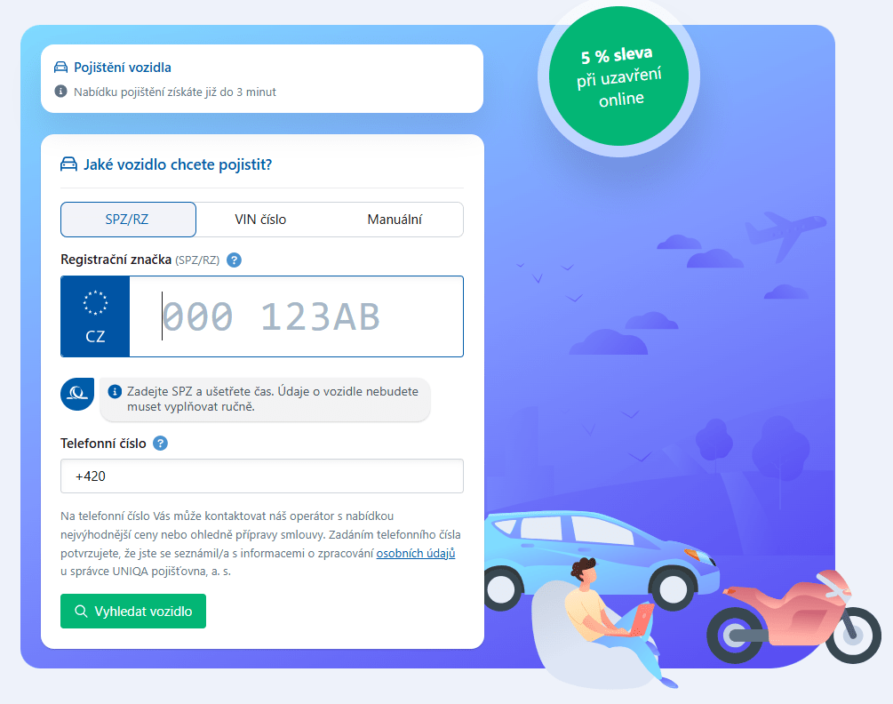 UNIQA kromě klasického sjednání pojištění nabízí také pojištění online. Proces jeho sjednání je velmi rychlý a jednoduchý – jak sama UNIQA na svém webu uvádí, může být vyřízeno do 3 minut.